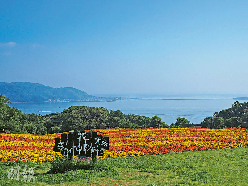 【明報專訊】在福岡想擁抱陽光與海灘,能古島亦是不錯的選擇,從福岡市的姪濱(姪浜)渡輪碼頭乘船約10分鐘即達。島上的能古島海島公園一年四季都有花卉盛開,如春季可欣賞油菜花、櫻花及杜鵑花,夏季有向日葵、繡球花及野雞冠花,秋季有大波斯菊及紅葉,冬季則有水仙及梅花。筆者於上月中旬到訪,橙黃色的萬壽菊於花田爭艷綻放,花期至7月上旬,緊接至8月下旬則是向日葵花期。公園設有攀爬設施、迷你動物園、滑草場等遊樂設施,亦可租借電動代步車,一日租金為500日圓(約25港元)。