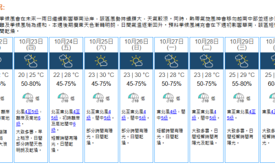 展望未來一兩日有狂風驟雨及雷暴,離岸及高地風勢頗大,海有湧浪。下周中期仍有幾陣驟雨。(天文台)