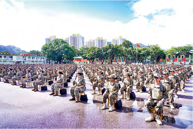 【明報專訊】「第17屆香港青少年軍事夏令營」前日喺解放軍駐港部隊新圍軍營舉行結業禮。喺歌聲同升國旗儀式下,嚟自本地130幾間中學500幾個參與學生著住制服,畀嘉賓同家長睇吓佢哋過去一個禮拜訓練嘅成果。