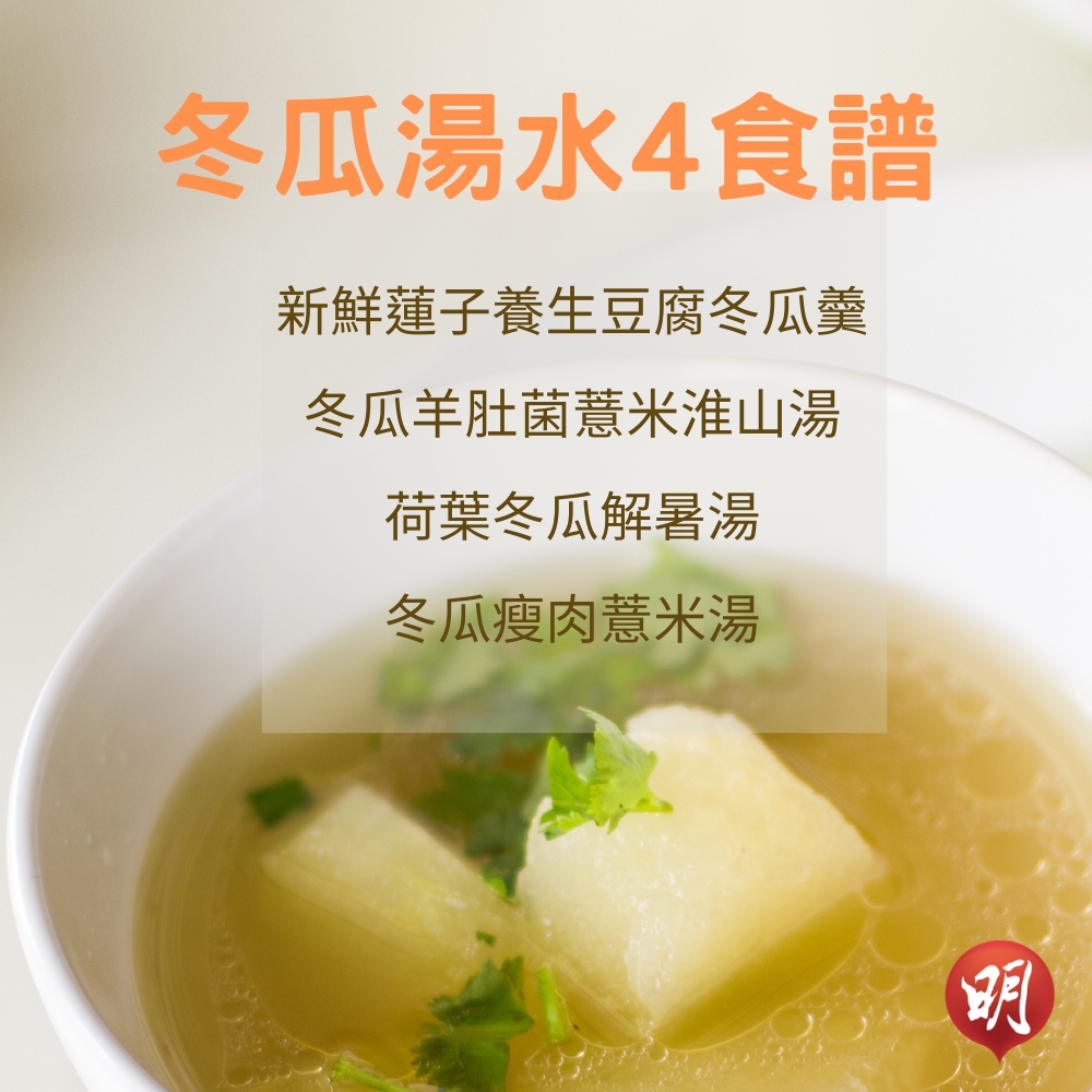 明日(7月22日)是二十四節氣的大暑,大暑天氣炎熱,雷陣雨多。中醫教路可吃瓜類(如冬瓜)補水,冬瓜性味甘淡微寒,能清熱解毒,止渴除煩,利小便。本文整理4個冬瓜湯水食譜。