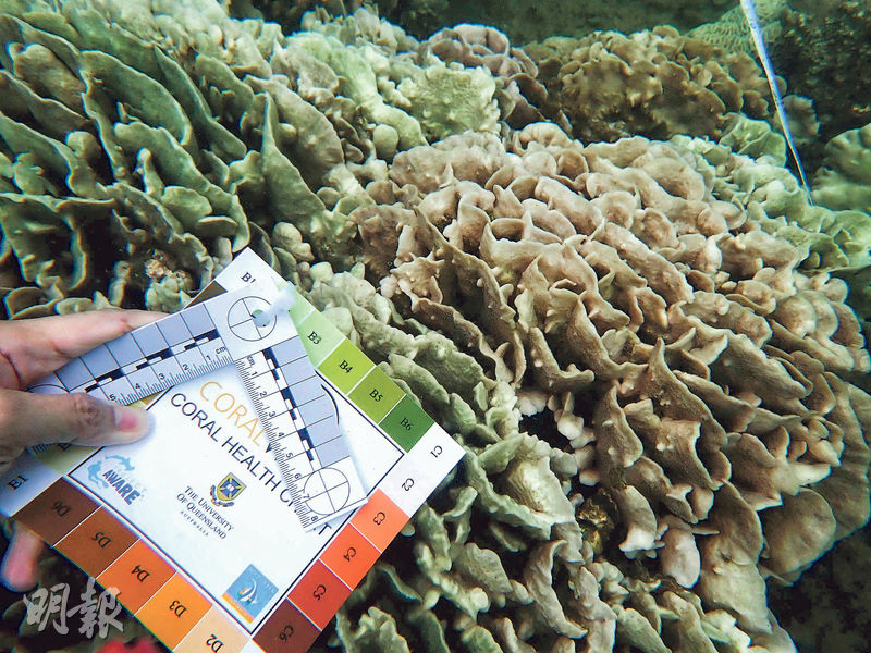 黃與團隊上周二統計橋嘴珊瑚群白化程度,其中運用了澳洲昆士蘭大學團隊設計的Coral Watch圖表,圖表分為4個色系,每個色系按顏色深淺分成1至6分,分數愈低則白化程度愈嚴重。黃稱,一般而言團隊科學家會隨機選擇20株珊瑚,肉眼對比同一株最深及最淺色的分數,相減除以2後得出分數,當日在橋嘴所見,大部分珊瑚在2分以下。