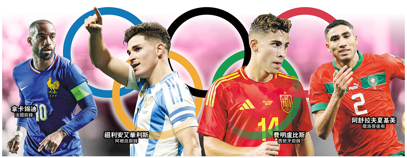 【明報專訊】巴黎奧運今晚展開賽事,由男子足球項目打頭陣,今晚9時揭幕戰由曼城前鋒祖利安艾華利斯「孭飛」的阿根廷隊,在B組迎戰巴黎聖日耳門(PSG)球星阿舒拉夫夏基美領軍的摩洛哥隊;至於其餘衝金熱門,東道主法國隊有老將射手拿卡錫迪領銜,西班牙隊亦有兩名新科歐洲國家盃冠軍成員助陣。