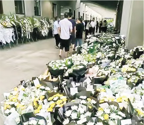 【明報專訊】浙江省溫州醫生李晟的遺體告別儀式昨晨6時半在市殯儀館舉行。到場悼念者身繫紅絲帶、手持白菊,向逝者獻花、鞠躬,並向李晟親屬致哀。告別廳外鮮花鋪滿長廊(圖,網上圖片),堆滿全國各地民眾送來的鮮花,紀念這名不幸喪生的醫生。有當地市民說,自己清晨5時就從家出發,為李晟送行。當地受颱風影響下雨,但很多人還是冒雨前來,亦有人特意從外地趕來。