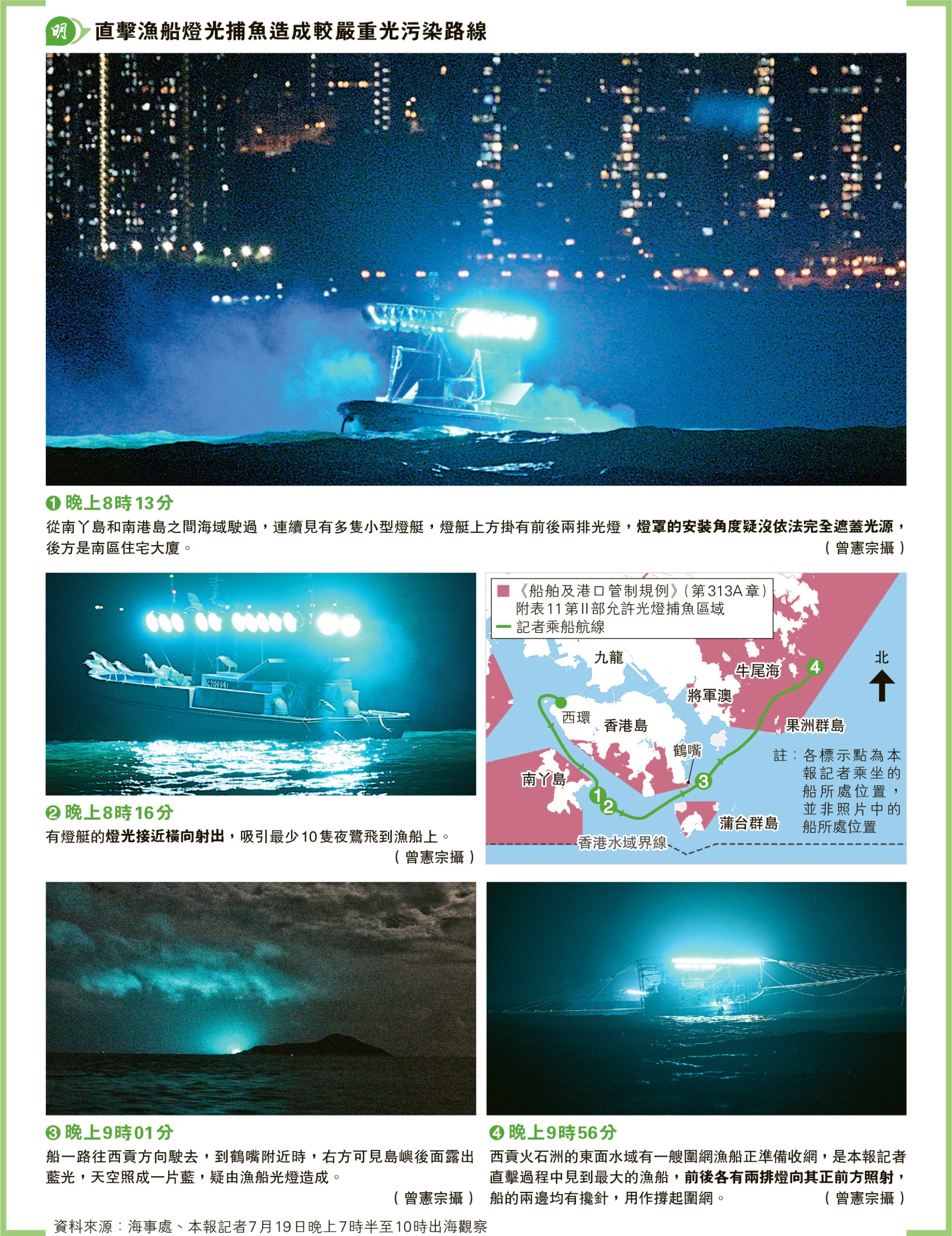記者乘坐的船再從南區向西貢方向駛去,見有不少發出刺眼光芒的船,有藍、綠、黃和紅光,途中在非法例容許光燈捕魚的區域見到不遠處有船使用燈光捕魚,又見有夜鷺疑被光線吸引而飛往及停駐燈艇。晚上近10時,船駛到西貢火石洲東面水域,一艘大型圍網漁船準備收網,漁船前後各有兩排燈光發出耀眼藍光,整個天空發藍。