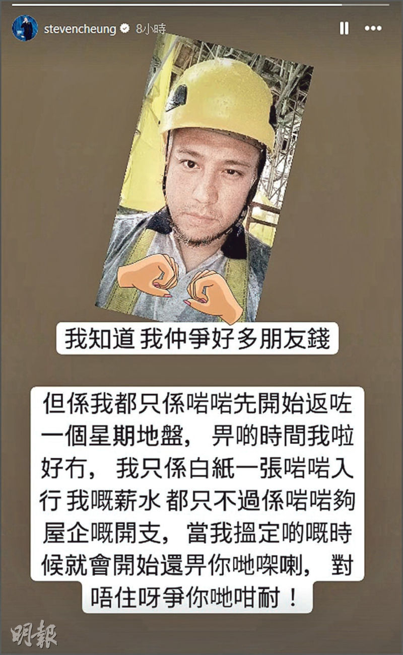 未知是否不少債主見Steven有工開,紛紛上門追債,昨日他在社交網限時動態貼出穿工衣戴安全帽照片,發文表示待工作穩定後會開始還錢,「我知道,我仲爭好多朋友錢,但係我都只係啱啱先開始返咗一個星期地盤,畀啲時間我啦,好冇,我只係白紙一張啱啱入行,我嘅薪水都只不過係啱啱夠屋企嘅開支,當我穩定啲嘅時候就會開始還畀你哋㗎啦,對唔住呀爭你哋咁耐!」