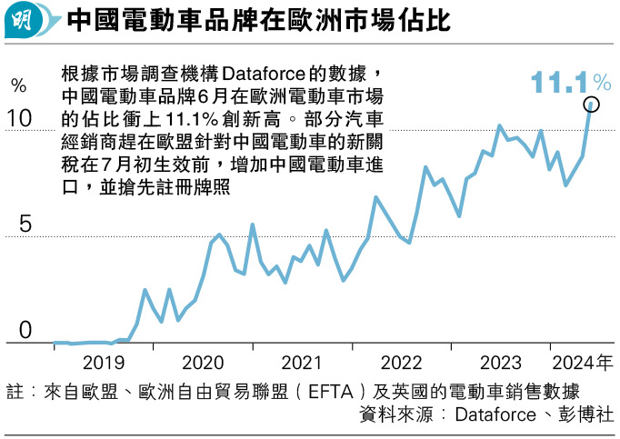 【明報專訊】在歐盟7月向中國電動車徵收臨時進口關稅前,中國電動車品牌6月在歐洲電動車市場的佔比衝上11.1%創新高。根據市場調查機構Dataforce的數據,中國品牌的電動車6月在歐洲的註冊量超過2.3萬輛,是歷來最高,較5月大增72%。在歐洲銷量第一的中國電動車品牌——上汽MG名爵有大量MG4揭背式電動車由經銷商登記註冊,是中國品牌電動車在歐洲市佔率上升的主因。根據歐盟規定,7月5日前註冊的電動車賣給消費者時,可毋須繳付新關稅。