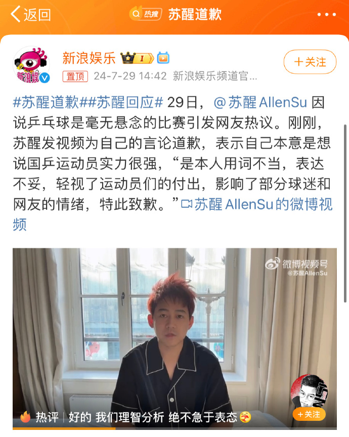 無獨有偶,內地歌手蘇醒與家人到巴黎觀看乒乓球比賽時,發微博稱「來看幾場毫無懸念的比賽」,同樣惹起爭議,網民批評其輕視運動員多年努力,也犯了「半路開香檳」的大忌。蘇醒之後道歉稱對乒乓球運動不是很了解,只想表達對中國隊的信心和支持,未來會「好好賣藝、少發言」。(綜合報道)