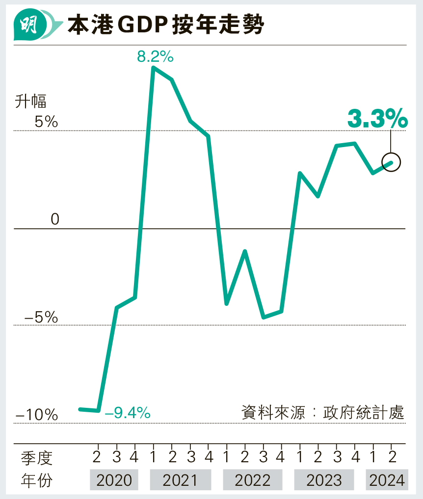 【明報專訊】政府統計處公布,今年第二季本地生產總值(GDP)預先估計按年增3.3%,高過市場預期的2.7%,較首季2.8%強勁,亦連續第六季錄得增長;經季節性調整後按季升0.4%,亦勝市場預期0.3%。不過,細項當中私人消費開支由升轉跌,有學者認為本地居民及旅客消費模式已轉變,相信將由外貿撐起本港未來經濟增長。