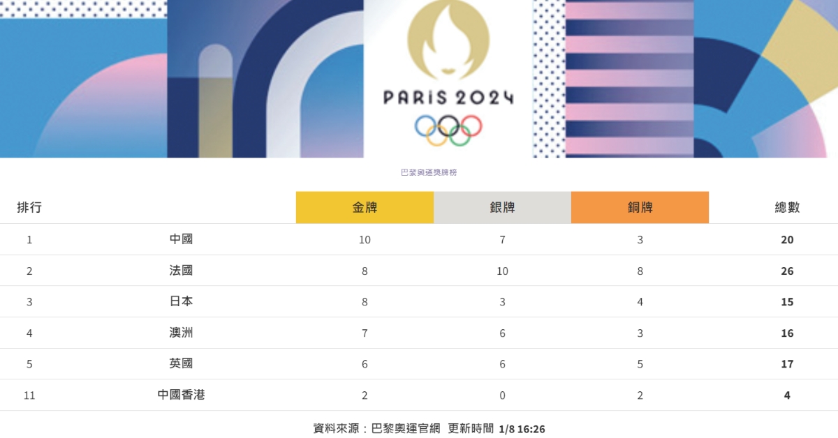 即時熱點 巴黎奧運奬牌榜|國家隊摘10金排榜首 港隊2金2銅 (16:26) 發佈於 1 年 前 2024 年 8 月 1 日 By 明報 【16:26】國家隊在巴黎奧運摘下第四面射擊金牌,劉宇坤在男子50米步槍三姿再添一金,國家隊累計獲得10面金牌,暫排獎牌榜首位。19歲超新星潘展樂在男子100米自由泳決賽,以46.40秒刷新自己保持的世界紀錄,為中國泳隊取得今屆第一面金牌[報道]。港隊「女飛魚」何詩蓓則在女子100米自由泳決賽中,面對瑞典隊名將施約唐及澳洲隊星將奧卡拉簡等勁敵,終以52.33秒奪得銅牌[報道],港隊本屆累計獲得2金2銅。 巴黎奧運專題報道:shorturl.at/zcQOH 相關文章:奬牌榜巴黎奧運編輯推介 Up Next 巴黎奧運奬牌榜|國家隊射擊添1銅牌 累計11金7銀7銅排榜首 (16:46) 不要錯過 天氣|天文台:雷雨區正影響香港西部 料未來一兩小時部分地區雨勢較大 (14:45) 繼續閱讀 贊助商 猜你喜歡 田徑|杜班迪斯12破撐竿跳世界紀錄 稱賽前承諾祖母刷新世績帶來壓力 (21:32) 游泳|麥堅杜殊5天內打破3項目世績 稱為保世界紀錄須游得更快 (19:20) 乒乓︱黃杜配世界賽3:0挫西班牙組合 連續兩屆闖4強鎖定獎牌 (16:16) 單車︱回應選拔作假風波 單車總會認溝通不足致歉 將因應調查報告協同港協跟進 (22:07) 單車總會主席梁鴻德被指巴黎奧運選拔試圖造假 事後報告證屬實惟無處罰 文體旅局:期望體育總會選拔制度公平透明 (16:05) 單車|梁鴻德被指巴黎奧運選拔試圖造假 單車總會前行政總監信事件屬「內部權鬥」 稱運動員沒受影響 (18:31)