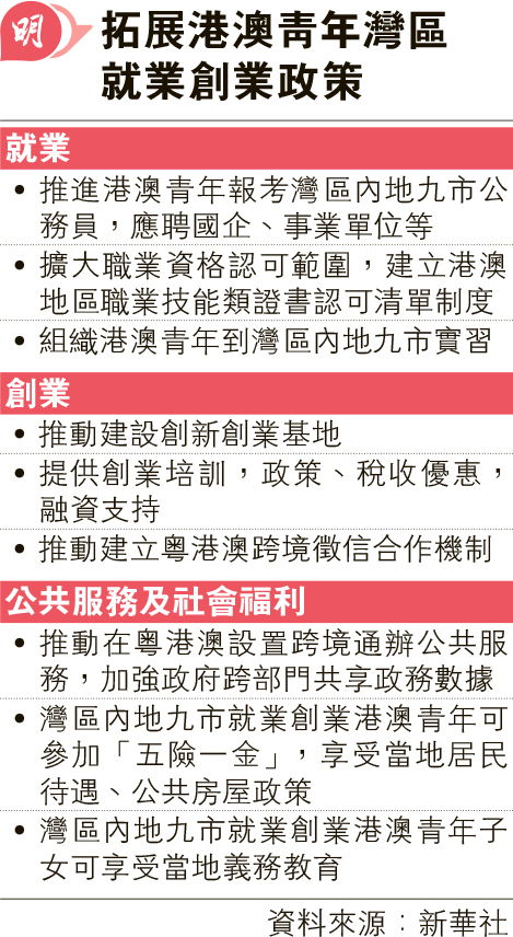 【明報專訊】廣東省人大常委會前日通過新例,推進港澳青年到粵港澳大灣區內地九市(下稱「九市」)就業、創業,包括允許港澳青年報考九市公務員,應聘國企職位,推動專業人才跨境執業,可享與當地居民同等教育、醫療、養老等社會福利,亦可申請住內地公屋。