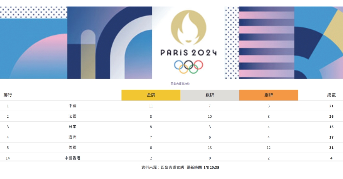 【20:35】國家隊在巴黎奧運摘下第11面金牌,暫居榜首。楊家玉在女子20公里競走摘金,為中國田徑隊本屆奧運首金。劉宇坤在男子50米步槍三姿奪冠,為中國射擊隊本屆第4金。19歲超新星潘展樂在男子100米自由泳決賽,以46.40秒刷新自己保持的世界紀錄,為中國泳隊取得今屆第一面金牌[報道]。港隊「女飛魚」何詩蓓則在女子100米自由泳決賽中,面對瑞典隊名將施約唐及澳洲隊星將奧卡拉簡等勁敵,終以52.33秒奪得銅牌[報道],港隊本屆累計獲得2金2銅。