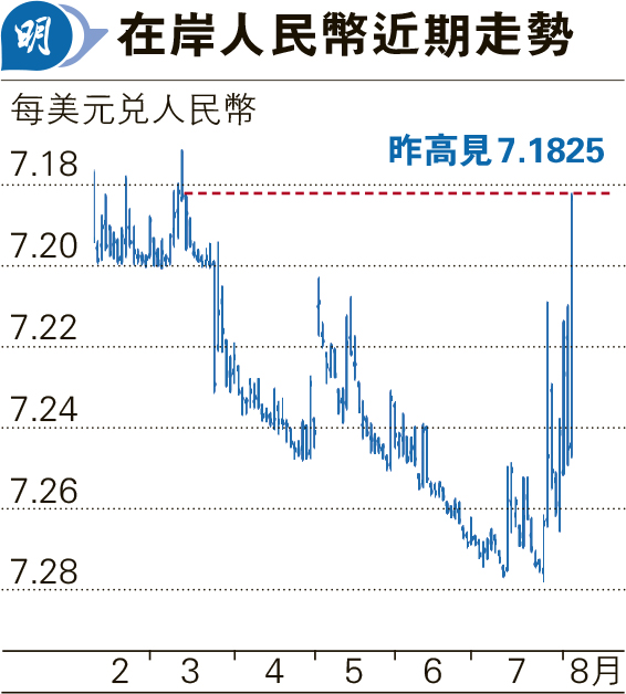 【明報專訊】日本央行周三意外加息,加快沽空日圓的套息交易拆倉,連帶過去同為套息目標的人民幣沽盤一同平倉,推動人民幣升勢。人民幣在岸價昨晚升至近7.18,為3月底以來高位。截至昨晚近9時,人民幣在岸價高見7.1825(見圖),上升約625點子(1元等於1萬點子),升幅逾0.86%,離岸價更曾大升逾1%,大幅跑贏其他主要非美貨幣。不過分析指雖然人民幣升穿近期交易區間,不過經濟基本因素較弱,人民幣及後仍有貶壓。