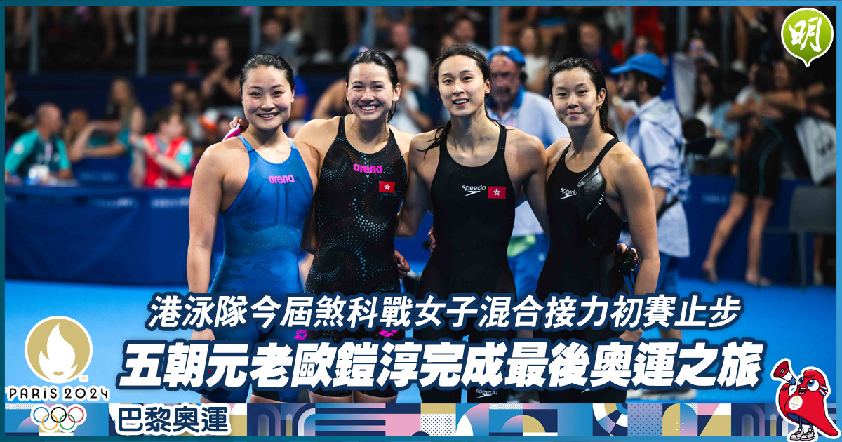 香港游泳隊今(3日)迎來今屆巴黎奧運最後一項賽事,由已奪兩面銅牌的「女飛魚」何詩蓓伙拍最後一屆征奧的歐鎧淳,連同譚凱琳及簡綽桐,在女子4×100米混合泳接力初賽第一組以第7名完成,總成績第13名,未能以前10名出線周一凌晨上演的決賽。