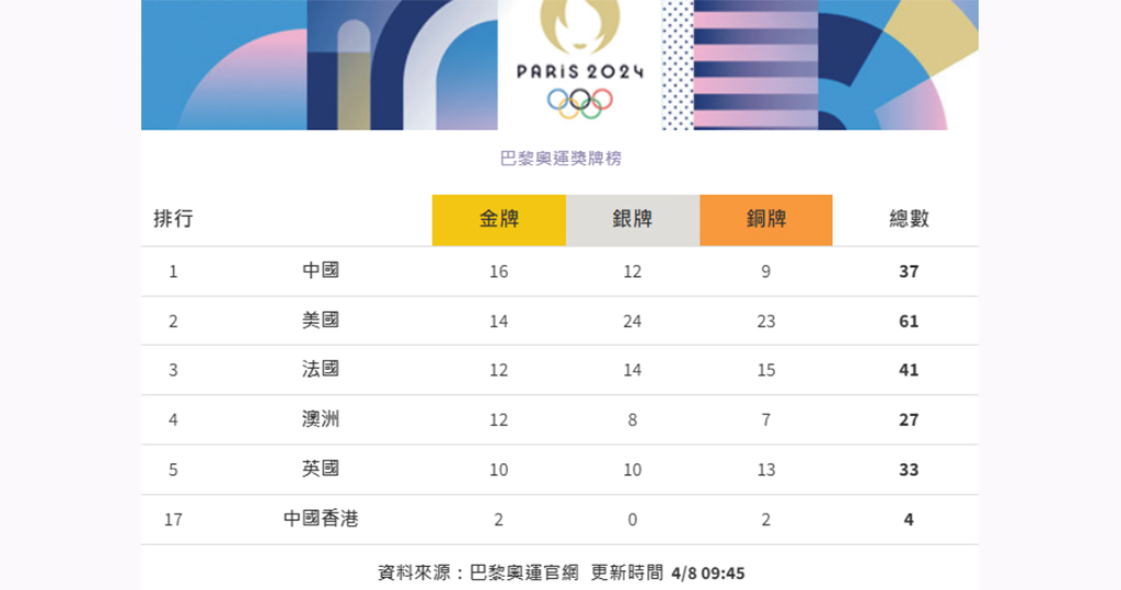 即時熱點 巴黎奧運奬牌榜|國家隊暫累摘16金12銀9銅 續居榜首 (10:00) 發佈於 1 年 前 2024 年 8 月 4 日 By 明報 【10:00】截至今日(4日)早上9時45分,國家隊累計獎牌數目為16金12銀9銅,續居獎牌榜之首。 巴黎奧運專題報道:shorturl.at/zcQOH 國家隊相關報道:shorturl.at/dcOD3 港隊相關報道:shorturl.at/JVf7z 相關文章:shorturl.at/dcOD3shorturl.at/JVf7z奧運熱點奬牌榜巴黎奧運編輯推介 Up Next Cosplayer名古屋商店街巡遊【多圖】 (15:15) 不要錯過 巴黎奧運|西班牙王后奧運觀戰打氣 網球場睇艾卡拉斯晉級、與女籃球員自拍【多圖】 (16:48) 繼續閱讀 贊助商 猜你喜歡 田徑|杜班迪斯12破撐竿跳世界紀錄 稱賽前承諾祖母刷新世績帶來壓力 (21:32) 游泳|麥堅杜殊5天內打破3項目世績 稱為保世界紀錄須游得更快 (19:20) 乒乓︱黃杜配世界賽3:0挫西班牙組合 連續兩屆闖4強鎖定獎牌 (16:16) 單車︱回應選拔作假風波 單車總會認溝通不足致歉 將因應調查報告協同港協跟進 (22:07) 單車總會主席梁鴻德被指巴黎奧運選拔試圖造假 事後報告證屬實惟無處罰 文體旅局:期望體育總會選拔制度公平透明 (16:05) 單車|梁鴻德被指巴黎奧運選拔試圖造假 單車總會前行政總監信事件屬「內部權鬥」 稱運動員沒受影響 (18:31)