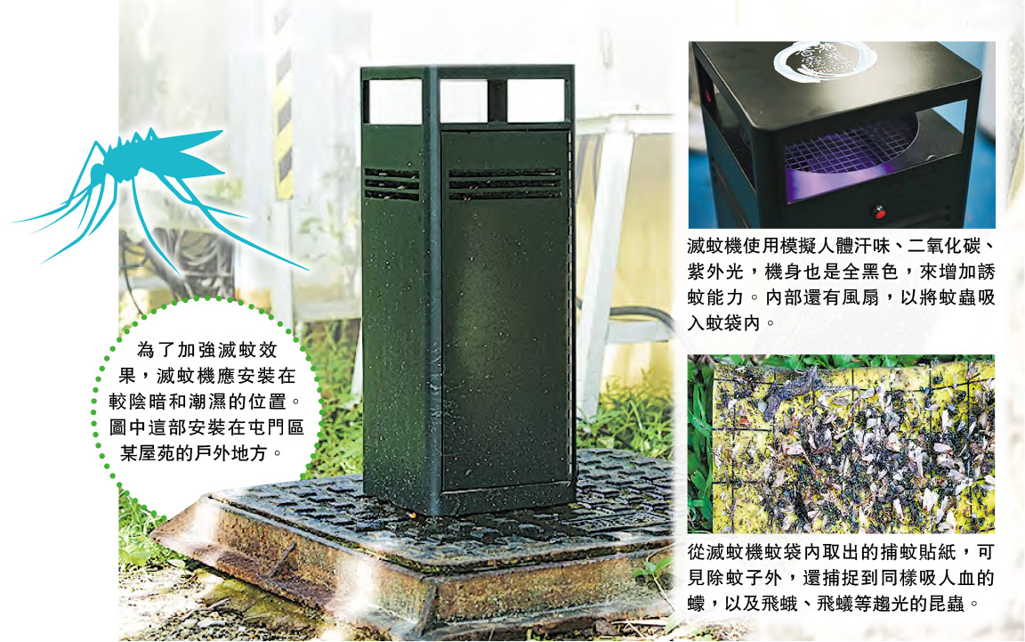 例如,私人屋苑使用的滅蚊機,通常都只使用紫外光來誘蚊。但紫外光誘蚊只是在晚上比較有效,在日間陽光充沛時,基本上沒有什麼作用。因為陽光中包括了紫外光,令到滅蚊機的紫外光在日間不太突出。