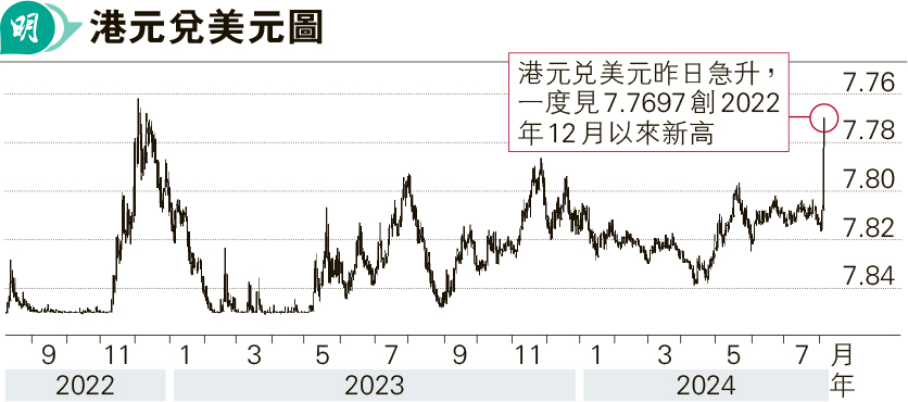 【明報專訊】日圓套息拆倉導致日圓匯率急升外,港元及人民幣匯價昨日亦顯著轉強。港元匯價昨日一度升372點子(1萬點子等於1元)至7.7702,逼近強方兌換保證水平,同時亦為2022年12月以來新高(見圖),截至昨晚8時,港匯升257點子報7.7817。有分析認為,港元昨突然回勇與美國上周五(2日)公布的數據遜於預期有關,市場對於美聯儲減息的預期再升溫,令先前利用港元及美元作套息交易的投資者拆倉,帶動昨日港元匯價上揚。