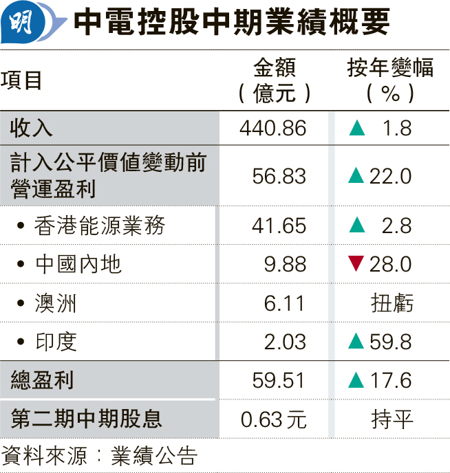受惠澳洲業務扭虧 中電中期多賺逾17%