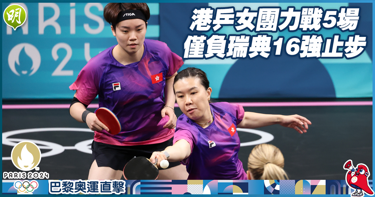中國香港乒乓隊今晨(6日)在巴黎奧運出戰女子團體首仗面對瑞典隊,頭3場均要鬥至決勝局及打足5場下,最終力戰逾3小時場數負2:3,在16強止步,無緣繼上屆東京奧運摘銅後再取獎牌。港乒亦已完成今屆所有賽事。