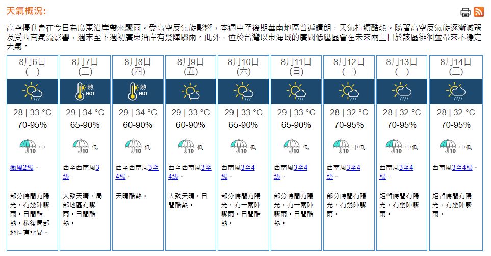 本港地區今日(6日)天氣預測部分時間有陽光,有幾陣驟雨。日間酷熱,市區最高氣溫約33°C,新界再高一兩度。稍後局部地區有雷暴。吹微風。展望未來兩三日持續天晴酷熱。(天文台)