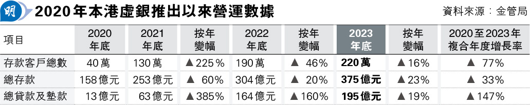 報告提到,自2020年8家虛銀開業以來,市場對其接受程度日益提升,其存款客戶數目、客戶存款金額,以及貸款與墊款額均見穩健增長,三方面於推出以來至去年底,亦錄得逾三成至1.5倍的複合年均增長率(見表)。金管局指出,虛銀於存款客戶總數與所有零售銀行的市場佔比較高,於去年顯著增加至8.8%。但以客戶存款、貸款與墊款及總資產計,虛銀與所有零售銀行整體市場佔有率於去年底約為0.3%,仍處於較低水平。