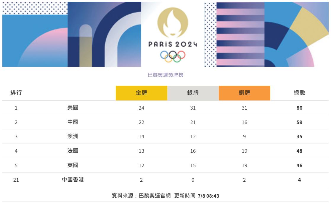 即時熱點 巴黎奧運奬牌榜|國家隊22金21銀16銅居亞 美國隊24金31銀31銅位榜首 (08:53) 發佈於 1 年 前 2024 年 8 月 7 日 By 明報 【08:53】巴黎奧運拳擊女子60公斤級決賽,國家隊楊文璐獲得亞軍,另一國家隊選手曹利國亦於摔跤男子古典式60公斤級決賽摘銀。國家隊再添2銀2銅,累計22金21銀16銅,奬牌榜排名第二。位居榜首的美國累計24金31銀31銅。 巴黎奧運專題報道:shorturl.at/zcQOH 國家隊相關報道:shorturl.at/dcOD3 港隊相關報道:shorturl.at/JVf7z 相關文章:shorturl.at/dcOD3shorturl.at/JVf7z奧運熱點奬牌榜巴黎奧運熱門HOTPICK編輯推介 Up Next 巴黎奧運|國家隊韻律泳融入甲骨文元素 摘歷史首金 法國「人臉泳帽」成熱話【多圖】 (15:48) 不要錯過 天文台取消黃色暴雨警告 (14:45) 繼續閱讀 贊助商 猜你喜歡 失眠|退熱貼包尾指助眠?中醫:對心煩燥熱難入眠者或有效 四肢冰冷、虛寒者忌用【附2款安眠茶飲】 (16:50) 全運會2025|短片:啟德體育園傳火炬 教師帶學生現場感受「很開心」 (12:49) 短片:維港海上大巡遊 多啦A夢Labubu充氣雕塑漫遊維港 (17:48) 全運會火炬傳遞周日舉行 香港路線一文睇 政總出發至啟德體育園 (15:56) 白宮發放習特會照片引熱議 特朗普展示紙卡 習近平瞇眼笑【多圖】 (15:09) 香港世一系列·短片|玩搖搖28年熱情依舊 世界搖搖大賽「世一」黃偉鑠:搖搖千變萬化連繫人與人 (12:48)
