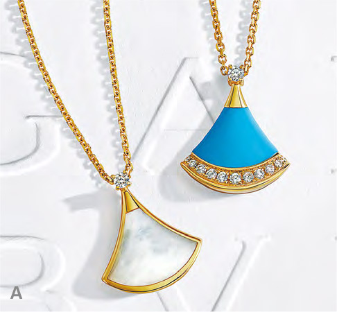 【明報專訊】在日常配搭中,穿戴一件簡單的珠寶已能夠點亮造型。Bvlgari以扇形為主題的Divas’ Dream系列設計簡約,最近推出全新款式,其中一款以天藍色綠松石搭配黃金(A),色彩和諧,可輕易疊戴和混搭。