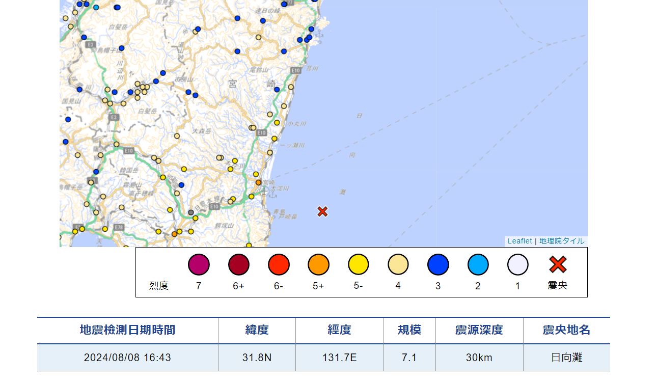 即時國際 日本宮崎縣近海7.1級地震 (16:26) 發佈於 1 年 前 2024 年 8 月 8 日 By 明報 日本九州宮崎縣近海周四(8日)下午發生黎克特制7.1級地震,震源深度約30公里,氣象廳在當地時間下午4時52分(香港時間下午3時52分),向大分縣、鹿兒島縣和愛媛縣沿岸,以及宮崎縣和高知縣發出海嘯警告,預計海嘯最高約1米。(NHK/共同社) 相關文章:地震宮崎縣日本編輯推介 Up Next 墨西哥新總統就職禮邀普京 烏克蘭促執行通緝令逮捕遭拒 (16:12) 不要錯過 旅行團涉違規闖泰國家公園洞穴 洪水淹洞致一死 (17:02) 繼續閱讀 贊助商 猜你喜歡 阿富汗北部地震 最少20死500傷 准韓建核動力潛艇 攪動區內勢力平衡 【東京】鏡頭下的震災重生敘事 高市談對華盼穩定認疑慮 首施政演說 增防衛費修訂安保文件 俄秘密建海底監控 北極追蹤北約潛艇 日本秋田縣再發生野熊襲人事件 釀1死4傷 (19:09)
