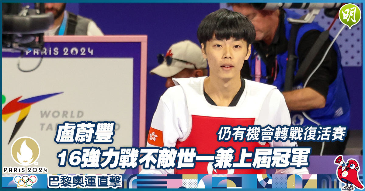 港隊史上首名出戰奧運跆拳道項目的盧蔚豐,今(8日)出戰男子68公斤級賽事,先於資格賽以局數2:0淘汰難民隊代表艾戈坦尼(Yahya Al Ghotany)的他,其後在16強惡鬥「世一」兼上屆金牌得主的烏茲別克隊名將拉舒希托夫(Ulugbek Rashitov),雖然全場被動但末段仍能取下兩分,最終以直落兩局0:12、2:9飲恨,但仍有機會轉戰復活賽。