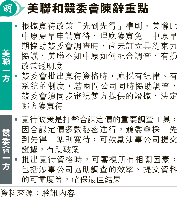 對於中原曾向競委會提交文件,石永泰稱有關證據僅屬傳聞證供,不符合為執法行動提供「重大協助」的定義。石表示,假設有兩間公司合謀定價,其中一公司協助調查,故獲寬待資格,另一公司不獲寬待;前者可隨時拒絕配合調查,撤回之前證據,同時後者被拒絕寬待,情况猶如「兩敗俱傷」(the worst of both worlds)。