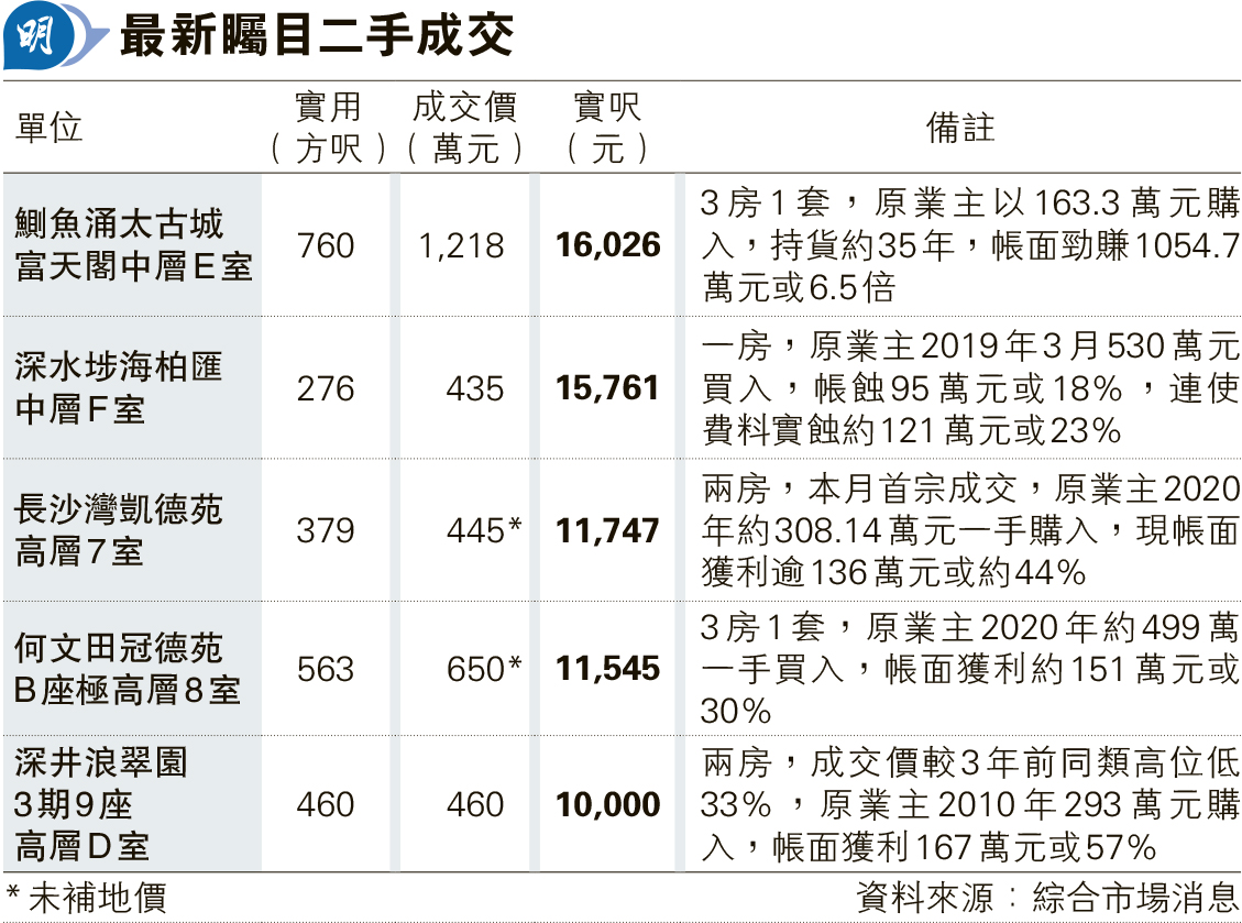 另何文田冠德苑一個3房戶則獲白居二客承接。中原高級資深分區營業經理余社朝表示,冠德苑B座極高層8室,實用563方呎,3房1套間隔,最新以650萬元未補價沽出,實呎11,545元。買家為外區白居二客,原業主2020年以約499萬元向房委會一手買入,持貨約4年,帳面獲利約151萬元或30%。