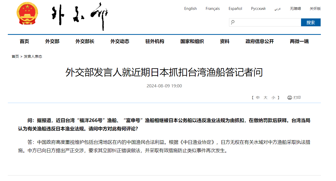 即時兩岸 日本抓扣台灣漁船 中國外交部提嚴正交涉 (20:48) 發佈於 1 年 前 2024 年 8 月 9 日 By 明報 近日台灣「福洋266號」漁船、「富申號」漁船相繼被日本公務船以違反漁業法規為由抓扣,在繳納罰款後獲釋。 中國外交部發言人今天(9日)表示,「中國政府高度重視維護包括台灣地區在內的中國漁民合法利益」,根據《中日漁業協定》,日方無權在有關水域對中方漁船採取執法措施。中方已向日方提出嚴正交涉,要求其立即糾正錯誤做法,並採取有效措施防止類似事件再次發生。(新華社) 相關文章:中日關係兩岸關係編輯推介 Up Next 【圖輯】七夕各地過節 東南賞「掩終」 (00:58) 不要錯過 中國在南海探獲全球首個超深水超淺層大型氣田 (00:36) 繼續閱讀 贊助商 猜你喜歡 蕭美琴歐議會演說 京嚴正交涉 出席IPAC峰會行程保密 台:外交大突破 鄭麗文赴白色恐怖追思 遭炮轟拜祭「共諜」 陸:台參與明年APEC須認一中原則 國台辦港澳局長任發言人 籲台胞認清統一大勢 日本駐港總領事:看好香港成為藝文樞紐潛質 籲維持營商友善文化自由 倡加强兩地合作 日「外國人問題」升溫 盼尊重彼此規矩