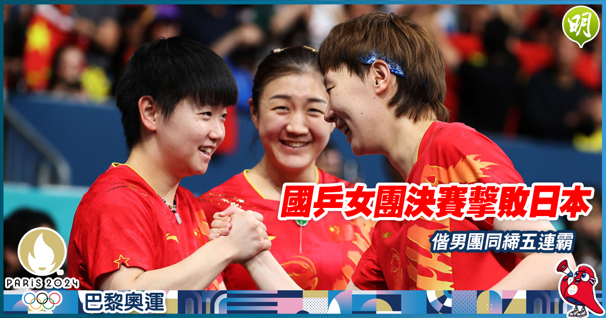 由今屆巴黎奧運女單金、銀牌得主陳夢與孫穎莎和「世三」王曼昱組成的國家隊,今晚(10日)在乒乓球女子團體決賽,以總場數3:0擊敗日本隊奪金,偕男團一同實現奧運五連霸,助國家隊取得巴黎奧運第37金。