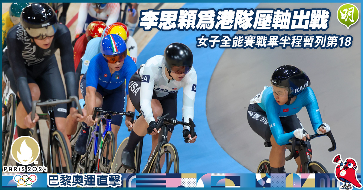 巴黎奧運今(11日)煞科,壓軸為港隊出戰的「小車神」李思穎於場地單車女子全能賽亮相,暫戰畢首兩項捕捉賽及配速賽後以20分暫列第18位。