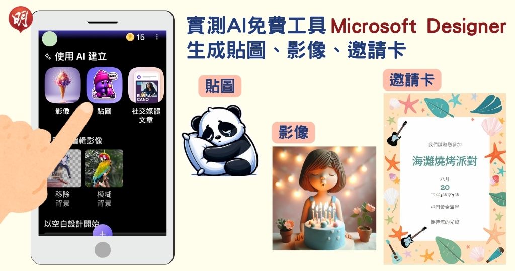 日常和親友發信息,不時用到貼圖(sticker),有否想過用人工智能(AI)生成有趣貼圖?微軟免費AI平台Microsoft Designer在7月中推出,有圖形設計及影像編輯功能,設網頁版和手機應用程式(App)。本文實測App版,輸入中文描述,數分鐘便能生成貼圖、影像和邀請卡。