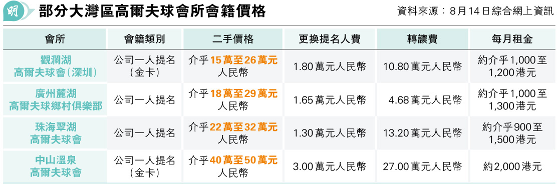 目前大灣區內的高爾夫球二手會籍可由10多萬元人民幣起,相對本港一般逾千萬港元的高球會籍親民得多,實際會籍價格一般會按會籍類別或級別而有所不同。