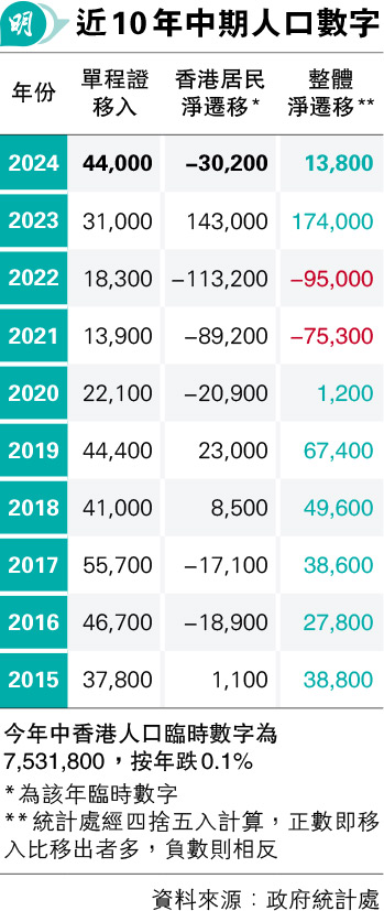 【明報專訊】政府統計處昨日公布本港人口臨時數字為753.18萬人,按年下跌0.1%,期內錄得淨移入人口13,800人,包括4.4萬人持單程證來港及3.02萬人淨移出;為連續兩年錄得人口淨移入,惟少於新冠疫前水平。2018及2019年分別每年約4.9萬人及6.7萬人移入。