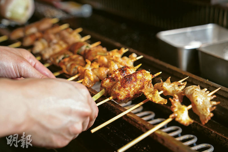 【明報專訊】走進灣仔船街,瞥見一間半露天開放式的燒鳥居酒屋自成一角。前門裝飾沒特別,往後一看,才發現放有幾張高桌,還有由Sapporo啤酒膠箱砌成的凳,一副東京巷子裏的居酒屋模樣,差在還欠一班鬆了領帶,邊喝啤酒邊吃串燒「吹水」的上班族。走進裏頭,昏黃燈光與熾熱焦香已撲面而來,串燒師傅的一雙摩打手已經在爐上不斷翻轉串燒,為辛勤了一整天的上班族,帶來肚皮和心靈的慰藉。