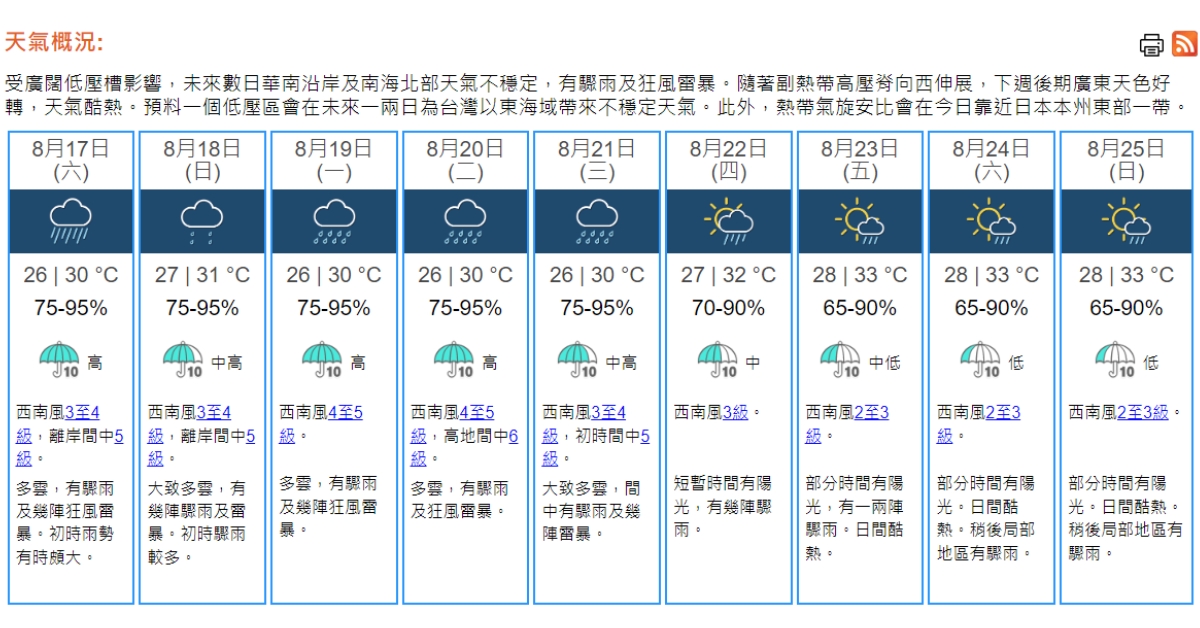 【09:02】上午8時50分,天文台錄得28.4°C,相對濕度78%。受廣闊低壓槽影響,香港以南海域及廣東西部沿岸持續有雷雨區發展。本港地區今日(16日)天氣預測大致多雲,間中有驟雨及幾陣狂風雷暴。初時短暫時間有陽光,稍後雨勢有時頗大,最高氣溫約30°C。吹輕微至和緩西南風。展望周末至下周初持續有驟雨及幾陣雷暴。(天文台)