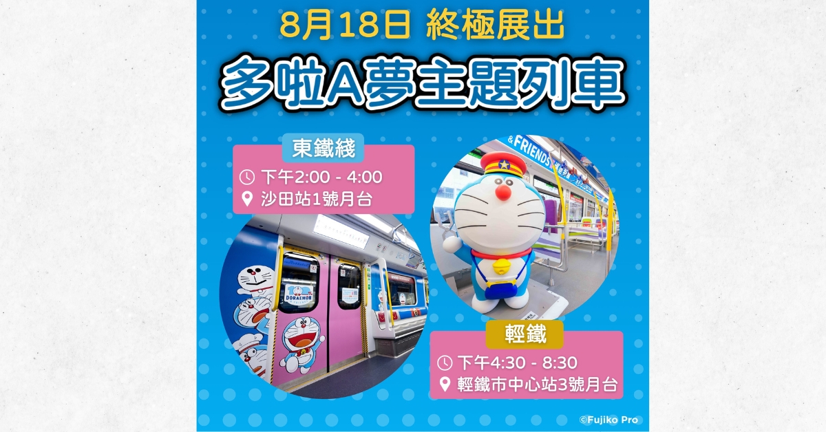 多啦A夢主題列車來到尾聲,港鐵輕鐵、東鐵線及機場快線的多啦A夢主題列車將行駛至8月18日*,東鐵及輕鐵主題列車將於當日分別停泊在東鐵沙田站及輕鐵市中心站,壓軸展出讓公眾影相和告別。