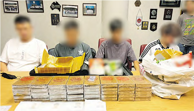 泰國毒品管制局辦公室上周五(16日)舉行記者會,公布在蘇凡納布米國際機場破獲一宗偷運毒品案。從當地傳媒發布相片可見4名男疑犯,年齡未明,桌上放了40塊懷疑海洛英磚、4人的香港護照及幾部手機。