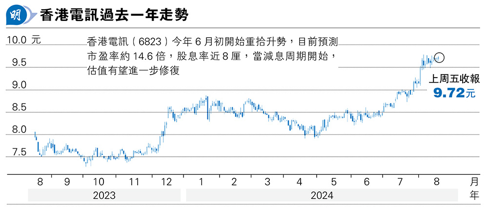 不過,若至今無貨在手,又想搵逾6、7厘的高息股,可能要轉吼股價表現相對落後的本地電訊股。當中,香港電訊(6823)今年6月初開始重拾升勢,現價預測市盈率約14.6倍,股息率近8厘,當減息周期開始,估值有望進一步修復。業務方面,香港電訊提供固網、流動通訊及寬頻服務,並致力由電訊服務供應商轉型為科技解決方案提供者,客戶包括個人、商用企業及政府部門,料收益可保持平穩增長。集團今年上半年盈利升2%至19.9億元,期內收入升2%至166.7億元,成本效益提升帶動EBITDA增長3%至61.7億元。