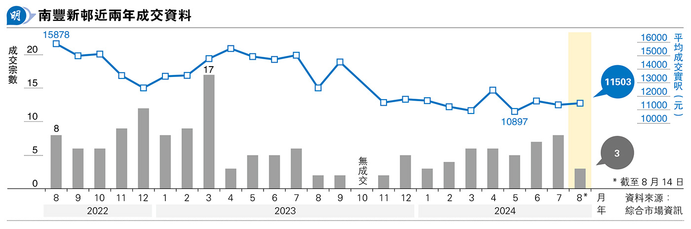 利嘉閣分行聯席董事吳玉蘭指出,南豐新邨第5座中層G室,實用面積391方呎兩房間隔,以450萬元易手、實呎11,509元;翻查成交紀錄,單位對上兩層同類單位,3月份、即「撤辣」初期曾以500萬元易手,反映是次成交價較約5個月前回落約一成。上述成交單位原業主,於2012年以420萬元購入,帳面仍賺30萬元或7%。吳續指出,近期受減息機會上升帶動,區內二手交投已見轉活,料下半年整體表現不俗。