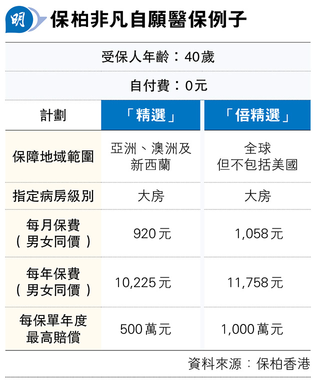 根據產品冊子資料,假設受保人為40歲(不論男女),投保「精選」計劃,自付費為零,每年保費為10,225元,每月保費920元;若揀「倍精選」計劃,同一條件下,每年保費為11,758元,每月保費1058元(見表)。若受保人還年輕,又願意支付自付費,每月保費可低至百多元;以投保「精選」計劃、自付費為8萬元為例,假設受保人為20歲,每月保費為148元。