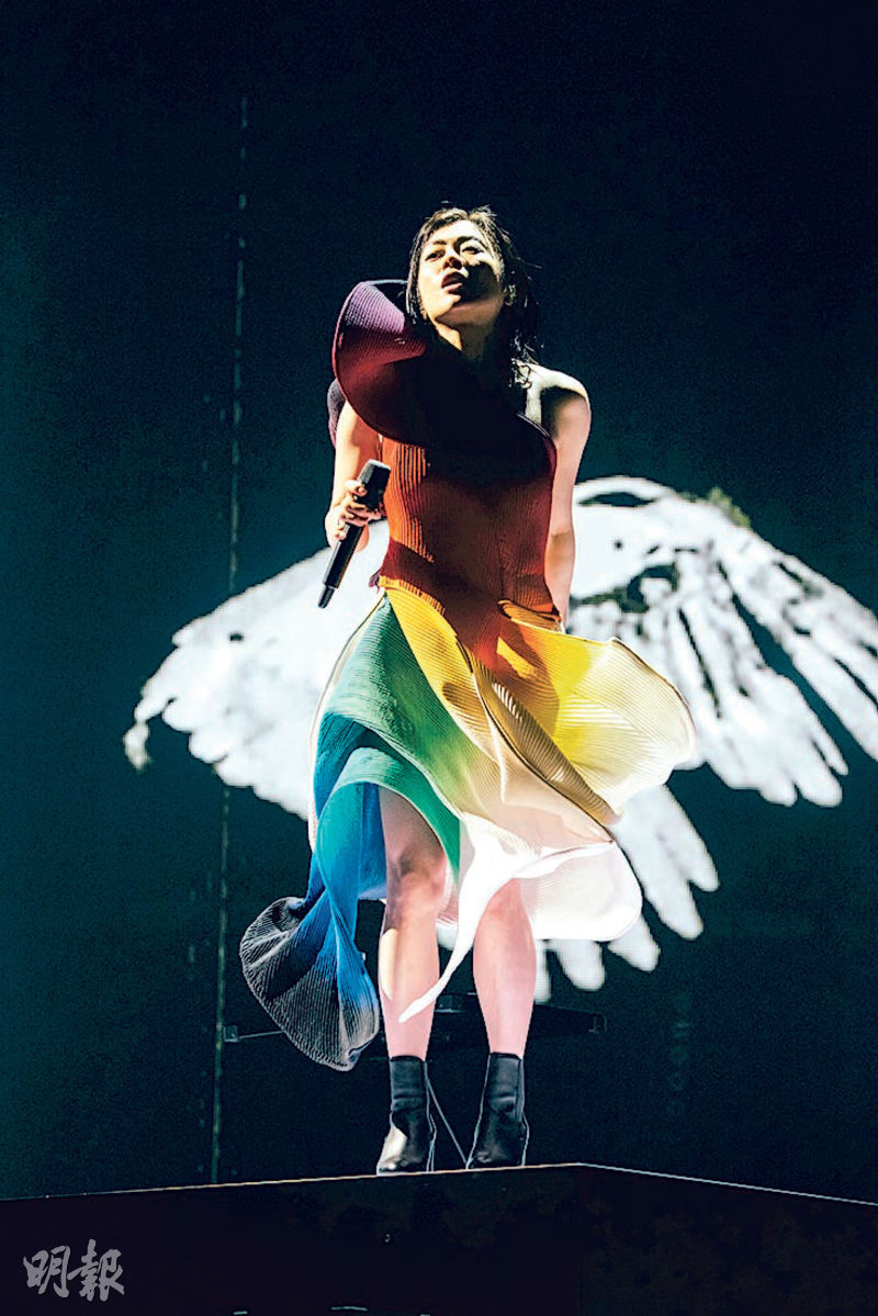 【明報專訊】日本樂壇天后宇多田光為慶祝出道25年,首次舉行「HIKARU UTADA SCIENCE FICTION TOUR 2024」亞洲巡迴演唱會,香港站一連兩場已於前日在亞洲國際博覽館Arena揭幕,吸引約1.4萬名觀眾捧場,座無虛席。本地藝人如吳業坤、吳雨霏等亦到場「朝聖」。宇多田光首個香港演唱會約8時22分開場,在全場粉絲歡呼下,宇多田光穿上白色套裝現身,以歌曲《Time Will Tell》揭開序幕。全晚個唱長約兩個半小時,合共演唱23首歌曲,並以三款不同造型示人,尤以日本著名設計師三宅一生旗下團隊A-POC Able Issey Miyake製作彩虹連身裙最華麗。宇多田光唱出代表作《First Love》掀起高潮,全場大合唱兼亮起手機燈,場面壯觀。她步出伸延舞台時,直言跟粉絲的距離超近,讓她有點害羞。