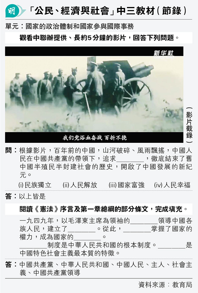 【明報專訊】初中公民、經濟與社會(公經社)科已試行一年,9月將從中一級起正式推展,惟中二、三級尚沒有已送審教科書。教育局繼去年發布中一、二級教材後,日前再上載中三級共4個單元的教材,其中一份涉國家政治體制,要求學生答對中國特色社會主義本質的特徵是「中國共產黨領導」。教材亦列舉5次修憲主要內容,包括2018年將「習近平新時代中國特色社會主義思想」寫入憲法。