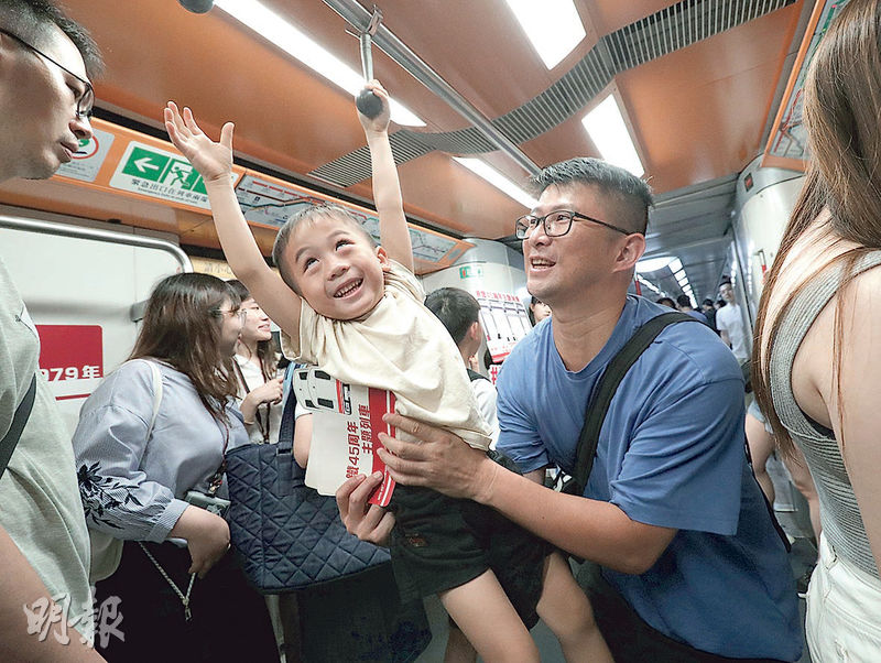 【明報專訊】港鐵為慶祝45周年推出的復刻版第一代「白頭列車」,繼上周四(22日)首次亮相後,昨午起正式投入載客。港鐵昨早安排列車在載客前短暫停泊彩虹站供公眾參觀,開放約1小時吸引逾1400人到場,有鐵路迷提早近兩小時排隊等上車,高呼「好興奮好刺激」,還率眾唱歌,說「希望每日搭到一次」。初代列車亦吸引「初代」乘客,有當年地鐵通車時搭過頭班車小孩,現已人到中年,昨到來重溫兒時對「波波扶手」的美好回憶。有巿民說復刻列車充滿笑聲,一洗現時港鐵車廂的死氣沉沉,令他想起1970、80年代的黃金年代。
