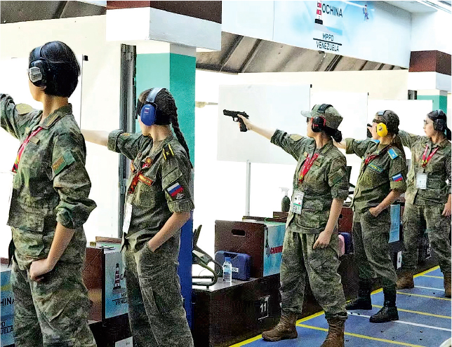 射擊是中國軍隊傳統強項,由陸軍步兵學院牽頭組建的射擊隊,在加拉加斯解放者靶場舉行的16個射擊項目中,奪得12金8銀4銅,包括男子25米軍用手槍團體賽、個人賽、快射團體賽,以及女子25米軍用手槍快射團體賽等多個項目以破賽會紀錄環數奪冠。《解放軍報》報道,此次參賽的中國學員們是首次參加大項賽事,沒有接觸過正式比賽用槍型號,是他們面臨的最大難題,比賽期間也出現多次槍支卡彈等問題,考驗學員應對能力和心理素質。
