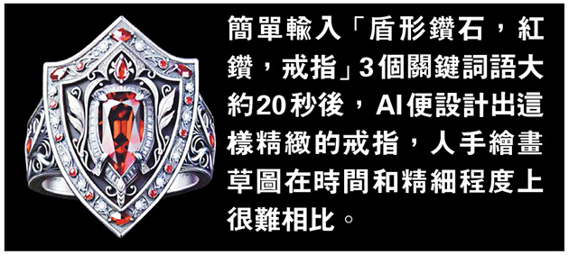 但問題是,很多時顧客未必能夠清楚表達其設計要求,店員往往要來來回回,修改或重繪草圖多次,才能令顧客大致滿意。單是這個階段,便可能需要大約一星期。使用AI來生成首飾圖片之後,相對於手繪草圖,明顯有多個好處。首先,是創作的自由度大了。因為AI設計首飾的某些線條,是人類未必想得出的。更重要的是速度快。因為輸入要求之後大約20秒,就可以生成一幅好像相片般的首飾圖片。即使生成10幅片,才有一幅令顧客滿意,也只是20至30分鐘內的事情,就已經鎖定訂單。