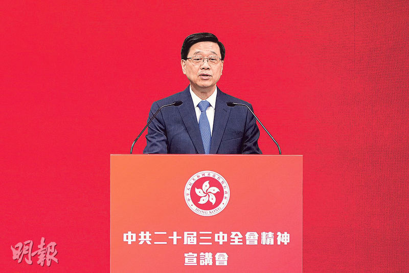【明報專訊】政府昨舉行兩場中共二十屆三中全會精神宣講會,其中早上一場在政府總部閉門進行,同樣由全國人大法工委主任沈春耀及商務部長王文濤分享。特首李家超會後表示,香港必須勇於改革,因地及因時制宜推進各方面工作,並要將三中全會精神應用在日常事務,融會貫通。