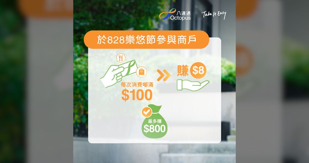 8月28日至9月10日期間,長者用樂悠咭在參與商戶單次消費滿$100或以上,可享$8現金回贈。